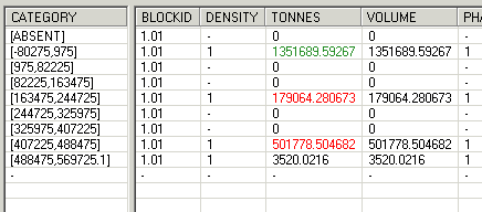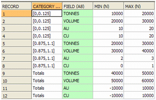 The CATEGORY field lists the evaluation interval (commensurate with the loaded evaluation legend) to which the particular color 'rule' applies. In the first record of the table above, the ore grade category representing all ore grades between zero and 0.125 g/t is made subject to a color rule; for the selected category, if the reported tonnage (combined or otherwise) exceeds 20000 tonnes, the result is to be displayed in red, and if it falls below 10000 tonnes, it is to be displayed in blue. For the same category, other rules are dictated for the VOLUME, AU and CU fields.