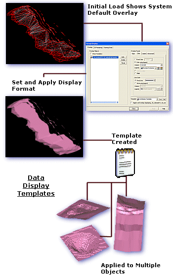 A data display templates can contain variety of information. In a simple form, a template could be used to, say, color an object red, and rendered in 3D. This type of display template is relatively generic and can easily be transferred to other object overlays of the same object type (it is not possible to apply, say, a wireframe display template to a block model, for example).