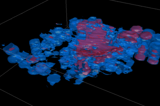 In the following example, isosurfaces were generated for a model according to data held in a user-defined "S" field. 2 unique values could be found in the data set; 2 and 4. By setting the Isolevels Column to [S] and the Isolevel Type to Passing Value(s), the surfaces were generated shown as below:
