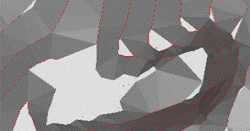 Minimize flat triangles: when generating a mesh from contours, facets may connect to the same contour line. Selecting this option will perform a pass after the initial tessellation to flip connections to minimize this effect. The effect of this setting can be hard to visualize, but is best described by means of an example. The following image shows a magnified section of a topographical contour string file. The area highlighted in grey represents the area where most 'decision making' must be made by any surfacing routine, due to the multitude of options for connecting separated vertices: