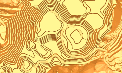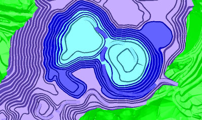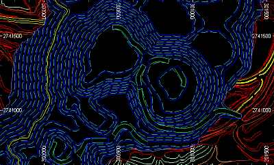 The important point to note about the central image is that, despite the presence of green pit road strings rising out of the pit base in the original image, these strings are not closed, and as such, it is either the surrounding blue bench strings that are used to color these features or the cyan color representing the lower pit contours - this is because these are the closest closed strings the encapsulate the wireframe triangle centroids of the pit road. Similarly, the extensive green area surrounding the pit contours doesn't tally with the first image; this is expected as the red / turquoise / orange contours do not represent fully closed strings. Although not shown in the image, the entire surrounding topography is enclosed by a green contour line, and it is the green attribute that is used to color this DTM region.