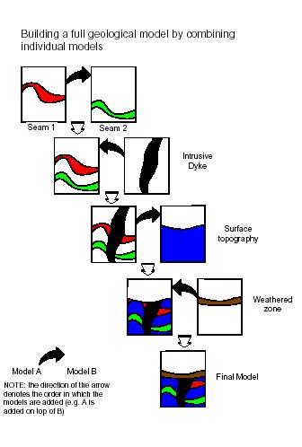 The order in which block models are combined is important. The following diagram shows the sequence in which individually modeled features need to be added in order to create a composite block model: