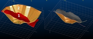For example, in the cutaway image below, a topography (Upper DTM) and a pit bowl (Lower DTM) are processed. The result is shown on the right with the original wireframes shown as sectional strings.