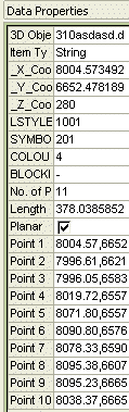 The contents of this window will be relevant to the data selected and the window in use. For example, to view the XYZ coordinates of all points on a digitized string, select the string (left-click) in the 3D window and a list of points and corresponding values will be displayed, along with string display properties and other general values.