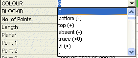 The display style relating to the selected object, in all cases, will be reported if such information exists, and a color preview bar will be shown to the left of these display items. In the above image, editable fields exist representing display formatting; LSTYLE, SYMBOL, and BLOCKID. Selecting one of these fields presents a drop down arrow, used to display a drop-down list from which a value can be selected, e.g.: