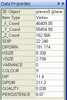 When a planes object item, i.e. a single plane, is selected in either the 3D window, the selected plane's data properties are displayed in the Data Properties control bar. In addition to the standard planes object fields and custom fields, an additional data property PERSISTENCE is displayed, as shown in the image below. The persistence value will be either the diameter of the plane circle, or the corner to corner distance of the plane rectangle (depending on whichDisplay Type has been set in the Planes Properties dialog). This read only value is calculated from the values listed in standard HSIZE and VSIZE fields.