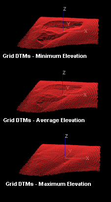 The following image represents the matrix of points generated when the Combine Elevations option is set to Minimum, Average and Maximum respectively. In this example, a grid increment of '10' was used to prevent the generation of a large density of grid points: