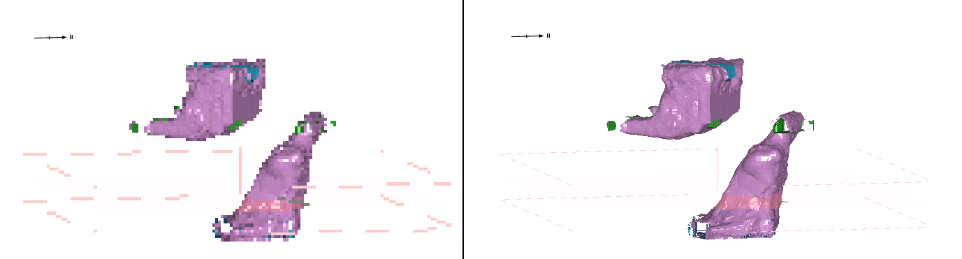 In the image on the left below, a 3D overlay group has been set to a deliberately low resolution (15 ppi). The same plot sheet is shown on the right at 150 ppi:
