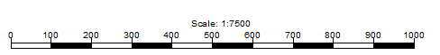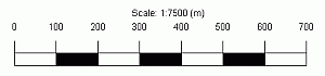 Scale bars are linked to a plot projection. A scale bar automatically adjusts to show a scale that is appropriate for the current projection. For example, adding a scale bar to a projection with a scale of 1:7500 adds a default scale bar to the top left of the project, like this: