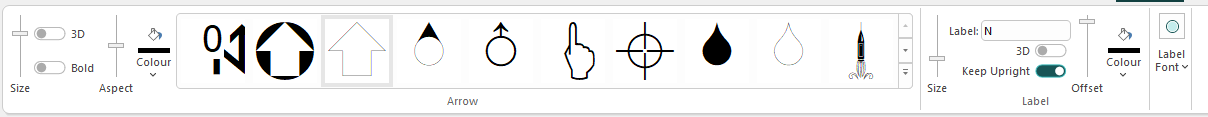 The options that appear depend on what you select. For example, selecting a Title Box plot item displays a ribbon to let you manage the arrangement of cells within it, whilst selecting a North Arrow item displays a different set of controls to determine the arrow's appearance: