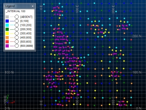 It can be seen in the graphic that the high density of sampling is in the high grade area. This means that parameter MAXMEAN should be set to zero so that the grid size with the minimum decluster weighted mean grade is identified as the optimum.