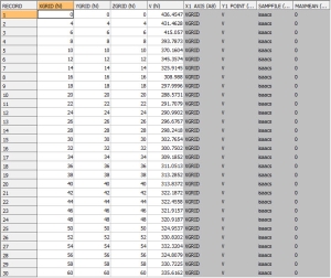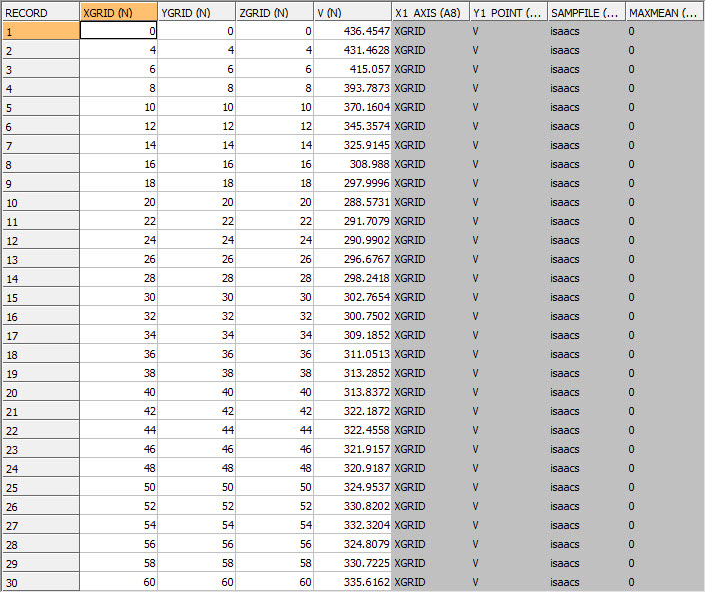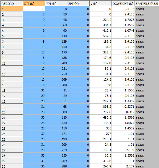 The WTOUT file contains the declustered weights. It is a copy of the input file for those samples with a non-absent *GRADE value with the extra field DCWEIGHT. The first 30 records of the file are shown in the graphic.