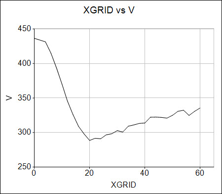 You can plot XGRID on the X axis against V on the Y axis of a line chart. It can be seen from the graphic that the decluster weighted mean grade (V) decreases until the X grid size reaches 20m and then starts to increase. This shows that the optimum grid size is 20m in X. In this example XFACTOR and YFACTOR are both 1 so the corresponding grid sizes in Y and Z also 20m.