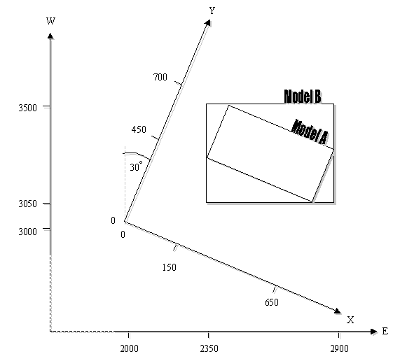 Figure 1 (Examples section) shows an example where MODELA has been created on a local grid shown as X-Y, and it is required to create a corresponding model, MODELB, on the N-E grid system. In this example there is a translation of the origin and a single azimuth rotation of -30o about the Z axis