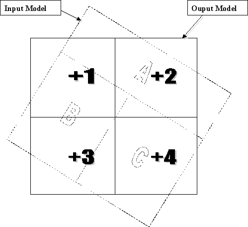The center point of each subcell in the output model is identified, and the subcell values are set equal to the corresponding point in the input model. If the &PROTO model file contains records then the &OUT model will have the same configuration of cells/subcells, but with values taken from the &IN model. If there is no corresponding point in the &IN model, then absent data values will be assigned in the &OUT model.