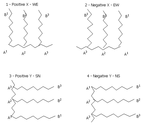 Seven parameters are required to define mining dimensions. These are illustrated in Figure 1. @ZXORIG, @ZYORIG, @ZZORIG define the starting point for zone modeling, and @DIRECTN defines the direction of mining advance. The direction must be parallel to either increasing X or Y direction. this is illustrated in Figure 2. @ZZORIG is the elevation of the base of the lowest bench for which zoning is required.