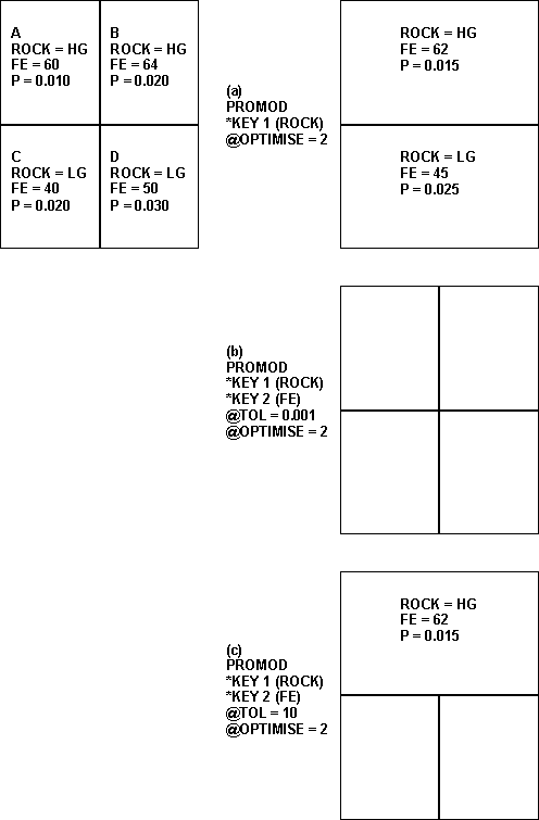 Specifying *KEY1(ROCK) will allow subcell A to be combined with subcell B, but not with C or D since they have a different value for ROCK (see Figure 3(a)). The values of the fields in the output subcells are volume or tonnage weighted averages for numerical fields. For alphanumerical fields they are the dominant value; that is the value with the greatest volume or tonnage. If PROMOD is re-run on the same input model, but with two key fields (ROCK and FE), no subcells are combined because none have the same value for FE (see Figure 3(b)). However, if the @TOL parameter is set to 10 then subcells A and B are combined, but not C and D (see Figure 3(c)). This is because subcells are combined if their numerical key field values are within @TOL of each other. @TOL is defined as a percentage of the total range of each key field. For instance (as in Figure 3(c)), an @TOL of 10 for a model where the total range of FE values is 50 (max=70, min= 20) means the tolerance in FE is 5. Subcells will be combined if: