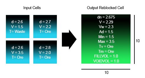 The new cells sizes can be any size and do not have to be an integer multiple of the input model parent cell size. Care should be taken if re-blocking to a smaller cells size because very large models can be specified. An error message is displayed if the selected cell sizes would cause the output model to exceed the system limits .