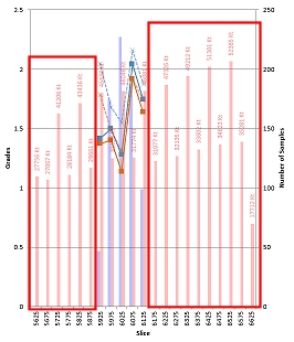 The results shown in the output files and the Excel spreadsheet include the number of sample records for each slice and a histogram on the plots. The sample record value includes records for any absent data grades. There may be different numbers of absent data values for the different grades. The number of sample records is shown in the results (NRECORDS).