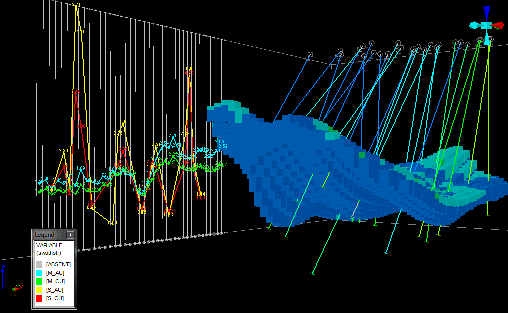 The output strings can be loaded to check the orientation of the swath slices and to see the relative grade values. Use a legend based on the VARIABLE field to colour the strings appropriately.