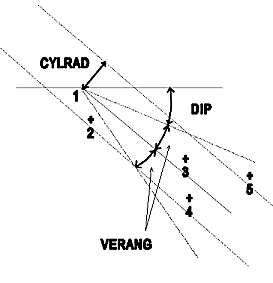If the range of dip angles includes 90o (vertically downwards from the rotated plane) then this represents a special case which is independent of the azimuth. For this 90o dip case there is a single angle of regularization which is the average of the horizontal and vertical angles @HORANG and @VERANG respectively. This average angle is used to define a cone with a circular cross section. The azimuth for the 90o dip case is recorded in the output file as 0o.