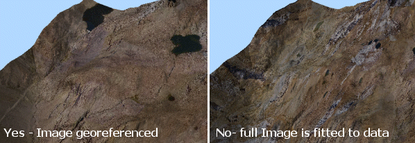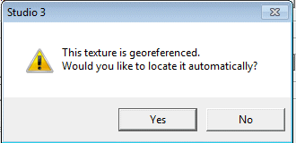 Many of the formats listed at the start of this topic have the ability to store additional metadata that represents the local coordinate positioning for the image file in relation to the loaded 3D surface. Where the loaded wireframe surface correlates with the image file (or files - multiple georeferenced images can be applied to the same surface. Similarly, a single image file may only be partly utilized to drape a smaller wireframe) this process is automatic, but you will have to accept the prompt that is shown when these extended image formats are loaded into the 3D window:
