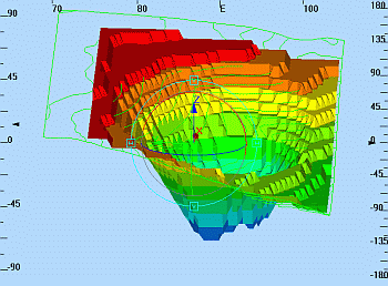 When setting up and using Viewpoints, the heading and pitch scales can be used to indicate the direction and dip of a particular view e.g. the direction and dip down a particular underground mining drive. When setting up and using flythroughs or driving 3D Objects along wireframe surfaces in Control Object view mode, the three indicators provide comprehensive orientation information for the moving 3D Object at any point along it's travel path. The latter may be used to check a detailed open pit ramp or an underground excavation haulage route design for irregularities in the drive surface.