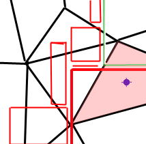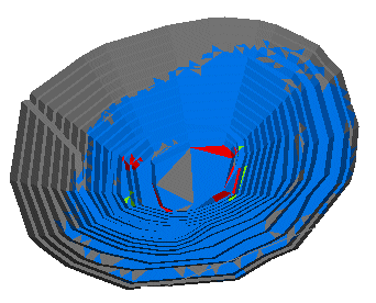 If inactive, the position of the centre of each wireframe triangle (the 'centroid') is important as the triangle will be colored according to the block model cell (or subcell) that it falls within, taking the color associated with the block model legend and column at that position. For example, in the image below, the centre of the wireframe triangle (shown as a blue dot) falls within a model cell that would be drawn in red: