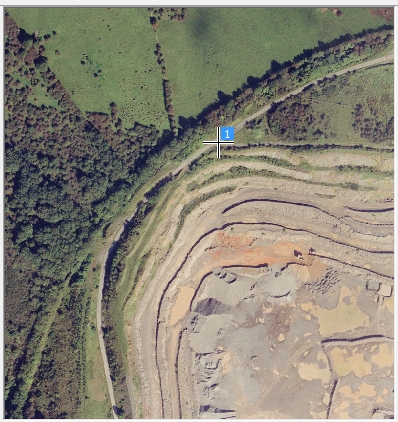 Left-click the junction of the main supply road and pit access lane, as shown below. Get as close to the specified point as possible - a reference point crosshair and "1" indicator will be displayed: