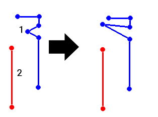 Note how the target string extends into empty space, but reaches a point at which it would intersect with the destination string if it were extended at one end.
