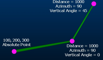 The next point in the traverse is created by defining a Distance and Azimuth, then either a Vertical Angle or Elevation. Once the new point has been defined and Added, it becomes the starting point for the next traverse specification.