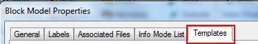 As with many 3D window functions, templates are accessible from any 3D window properties dialog, appearing as a tab that sits along the top of the dialog. For example, the Block Model Properties dialog looks like this: