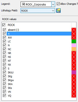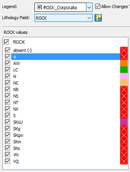 When a new Lithology Field is chosen, a check is made to see if a default legend already exists for the selected attribute. If it does, it is automatically selected and appears in the Legend field. The list of field values will update to show, where possible, the appropriate colour for each legend item.