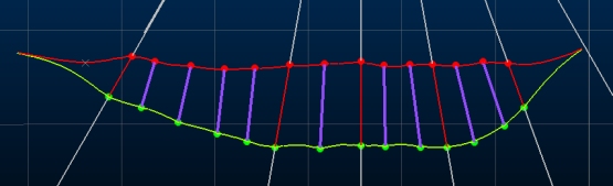 Implicit modelling tasks automatically format the view of loaded drillholes to highlight intercept positions such as hangingwall or footwall locations. For example, as red and green symbols below: