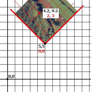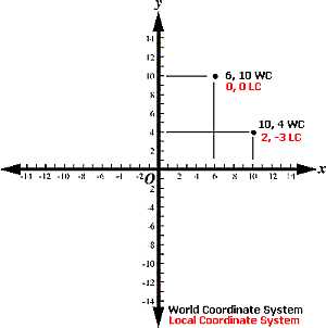 The resolution here is to apply a local coordinate system, a standalone system in its own right. The origin of the local system would be 5, 5 in a world coordinate reference - this point can be accurately described using either system. When a new system is applied, the system of plotting points on the map becomes a little more informative. In the image below, two points on the map are described in both local (red) and world (black) system coordinates: