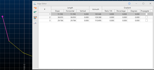 Each string edge is defined in terms of its Length (Slope, Horizontal, Vertical), its Azimuth and its Gradient (Ratio, Percentage and Degrees).