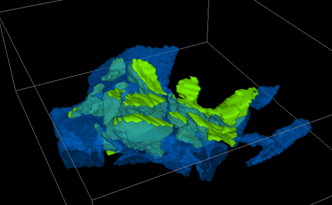 These surfaces were generated by selecting the Equal to Value(s) option and the ROCK Isolevels Column. The blue and green areas represent data where the ROCK value exactly matches the value 2, 3 or 4 - all other values are ignored. As such, the data areas are distinct.