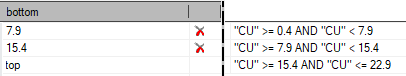 For example, the following image shows generated Copper value ranges and their corresponding filter expressions. The lowest detected attribute value is 0.4: