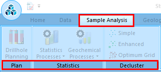 Select New Group and Rename your command group - this description will appear below the icons in the new command group. In the example, below, the Sample Analysis ribbon (tab) contains 3 groups; Plan, Statistics and Decluster: