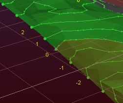 For example, in the image below, a single wireframe object is output and a new data column called REFSECT was added (via the first option, above). The resulting wireframe, if labelled using the REFSECT attribute shows how the string representing the intersection with the actual 3D section is labelled zero, whilst the sections above and below and labelled higher and lower respectively: