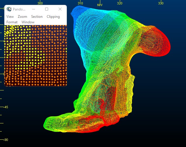 In this case, data density varies across the data (dense at the origin and less so at distance). This variation in density tends to make interpolated solutions struggle; the large gaps at distance from the monitoring tool can be misconstrued as air, breaking the resulting wireframe up.