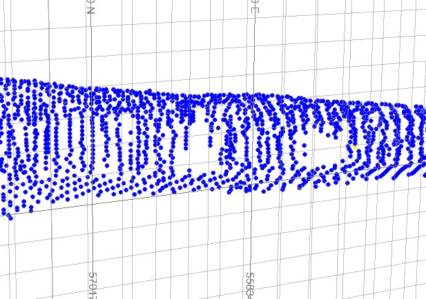 This example relates to data captured from a fixed CMS, resulting in fan of survey points originating from strings of a common origin, captured at regular dip changes. For example:
