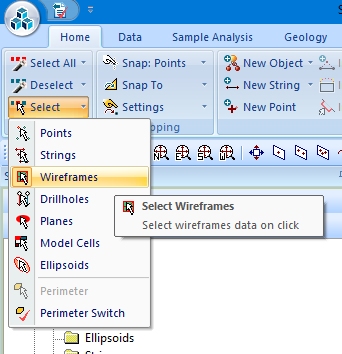 Full (object) or partial selection is possible, where a subset of wireframe data can either be constrained to selected triangles, a grouping attribute value, a surface, a filter or other options, as defined on the Project Settings screen.