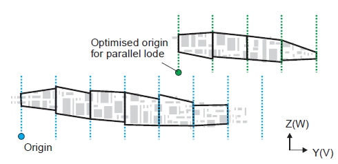Datamine's MSO module can be configured using advanced shape framework settings so that the stope-shape framework can be floated in the stope orientation plane (using defined increments). Thi sis a useful way to optimize the start location for both the level and section without changing the dimensions of the level interval (V-axis dimension) or section spacing (U-axis dimension).