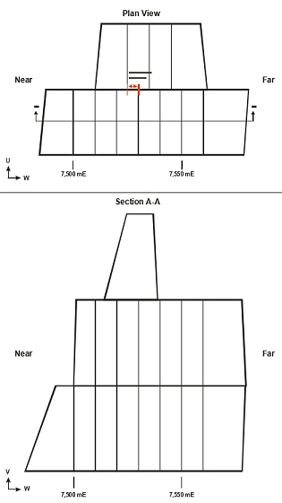 Longitudinal splitting is equivalent to applying U-axis (and/or V-axis) sub-stopes from a “full” stope. Selecting this option lets you define the number of splits in the U or V direction (not both). A maximum of 5 splits is permitted along the U or V axis.