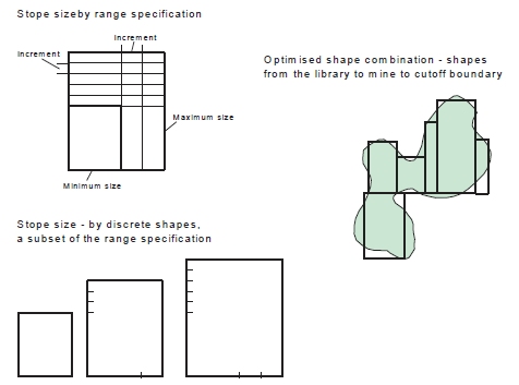 Stopes from the library would typically have dimensions that are an integer multiple of the grid increment, otherwise gaps would occur between adjacent stopes. The size of the grid increments might in some cases be the minimum stope dimension.