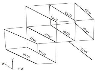 In the figure below, the strings have two additional attributes to identify the sections and levels, labelled as U1, U2, U3 and U4 for the sections, and V1, V2, V3 for the levels. A tube is generated where a volume is defined by adjacent sections and levels. If there is a missing section or level for one of the corner strings of a tube then no tube is generated: