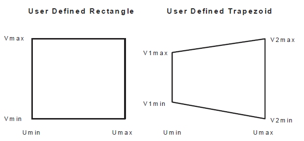 Stope Rectangles and Stope Trapezoids: for rectangular definitions (Stope Rectangles option), you can define your own U and V minimum and maximum values. The Stope Trapezoids option allows you to determine the additional point settings required to define the non-orthogonal shape. A trapezoid stope-shape has two opposite parallel sides and is defined by the coordinates (umin, umax, v1min, v1max, v2min, v2max).