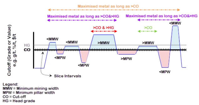 Intervals above (blue) and below (red) cut-off are identified, and the length of the interval relative to the minimum stope width (<MMW,>MMW) and the minimum pillar width (MMPW,>MPW) are identified. The area contributions above the cut-off (blue) have a positive contribution and the areas below the cut-off (red) have a negative contribution, with the goal to have a net positive area outcome.