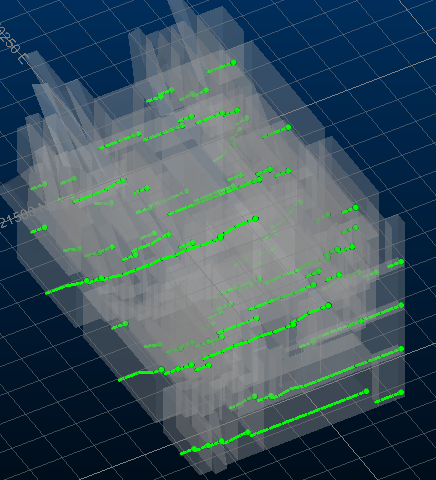 An example of output merged wireframe and string data - Mined Out Block Model(Slice Method only): if you have chosen (within the corresponding scenario) to generated a mined out model (on the Scenarios panel) you can choose to view it by selecting this check box.